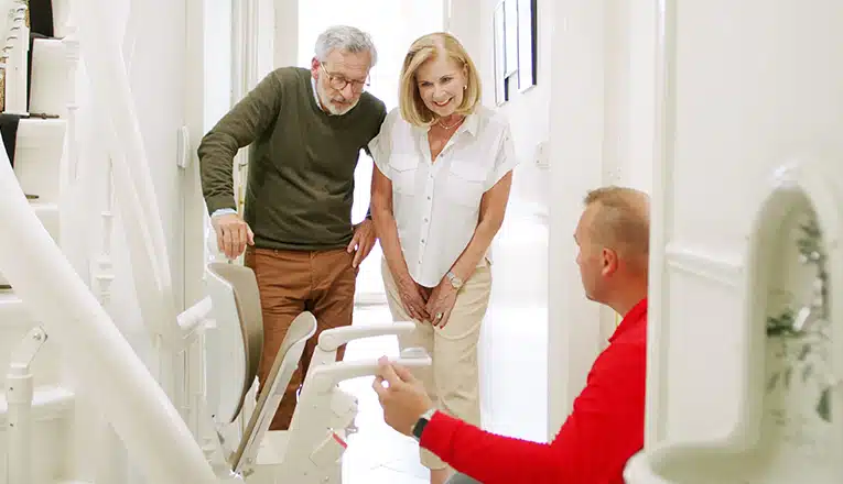 L’installation commence par une consultation à domicile.En effet, le choix des options aura une incidence sur l’installation. Lors de la consultation à domicile, un conseiller se rend au domicile. Il examine la situation des escaliers et discute des besoins. Avec le consultant, nous déterminons, par exemple, si le monte-escalier sera placé sur l’extérieur ou sur l’intérieur de l’escalier. Et si la rampe doit se prolonger un peu en haut et en bas de l’escalier pour permettre de ranger le fauteuil à côté de l’escalier.