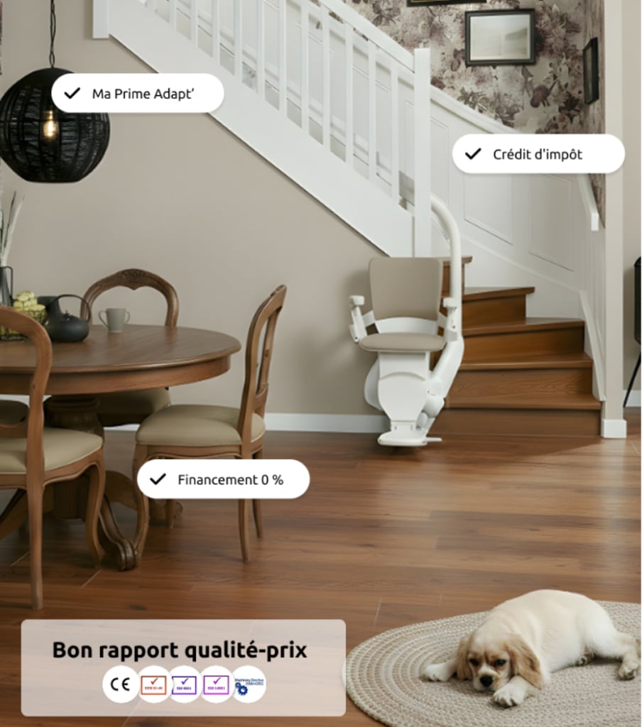 MaPrimeAdapt’ est une aide de l’État français qui soutient les travaux d’adaptation du logement (dont les monte-escaliers).
